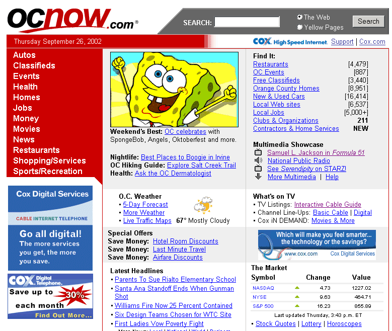 Background - In the Fall of 2001 Cox Communications' cable internet service provider (Excite@Home) was on the verge of bankruptcy. Cox quickly formed Operation Self Reliance, a task force charged with creating an internal ISP (Cox High Speed Internet). Cox Interactive Media's role in this initiative was to build a network of broadband web portals to replace the Excite startpages. I was promoted to the Broadband Content Manager position in October 2001 to lead this effort. The Excite startpages were scheduled to go dark in February of 2002, but this deadline soon shifted to December 2001. My team launched the network on time, and even added several more sites for new Cox markets in early 2002. However, in the third quarter of 2002, Cox announced an internal reorganization of internet operations which effectively halted all further broadband product development for the rest of the year.